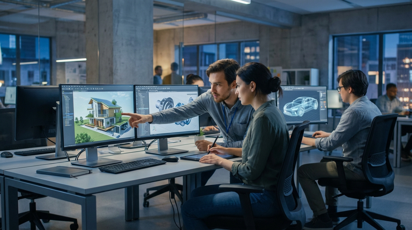 Trois designers travaillent sur des logiciels de conception 3D dans un bureau moderne. Des modèles de maison, pièce mécanique et voiture sont visibles.