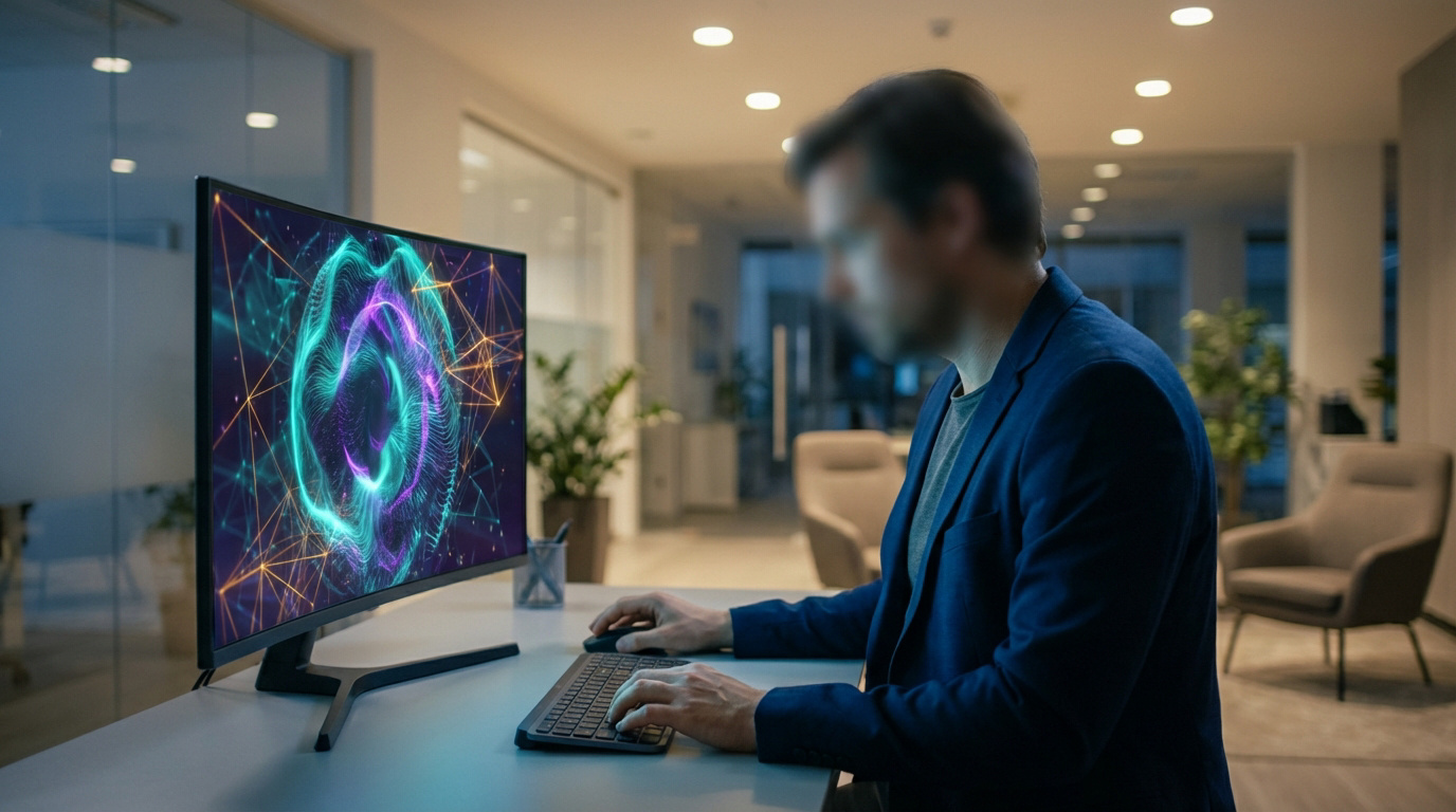 Un homme assis à un bureau moderne, concentré sur un écran d'ordinateur incurvé affichant un design abstrait et coloré. Il utilise un clavier et une souris.